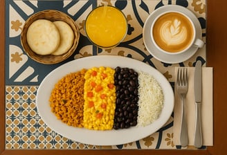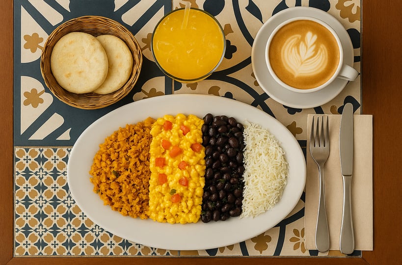 Carne Mechada, caraotas, perico, queso a la plancha, tajadas, 2 bollitos aliñados.